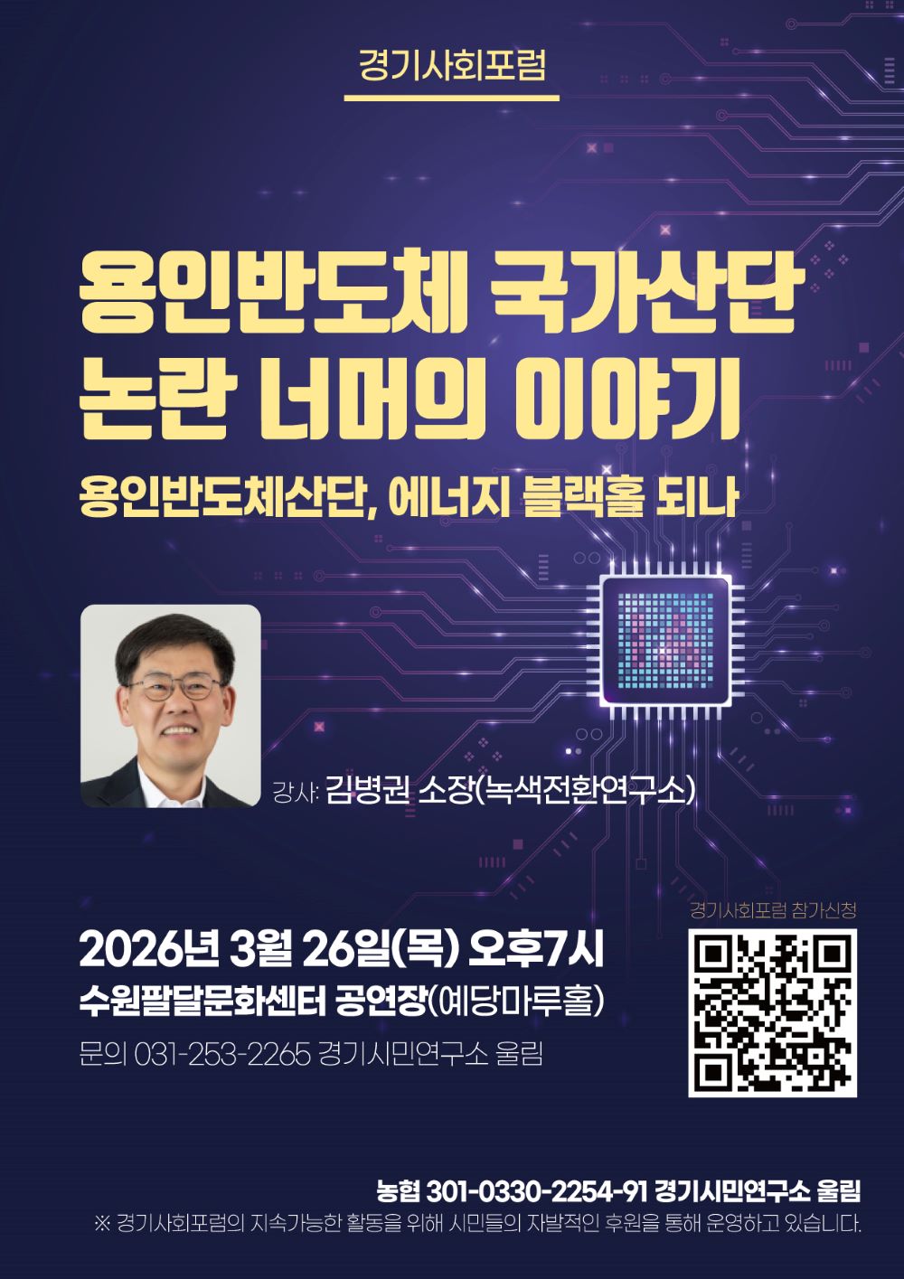 2026년 3월 26일(목) 오후7시 / 수원팔달문화센터 공연장(예당마루홀)에서 김병권(녹색전환연구소) 소장님을 모시고 '용인반도체 국가산단 논란 너머의 이야기' -용인반도체산단, 에너지 블랙홀되나-'의 주제로 3월포럼을 개최합니다.